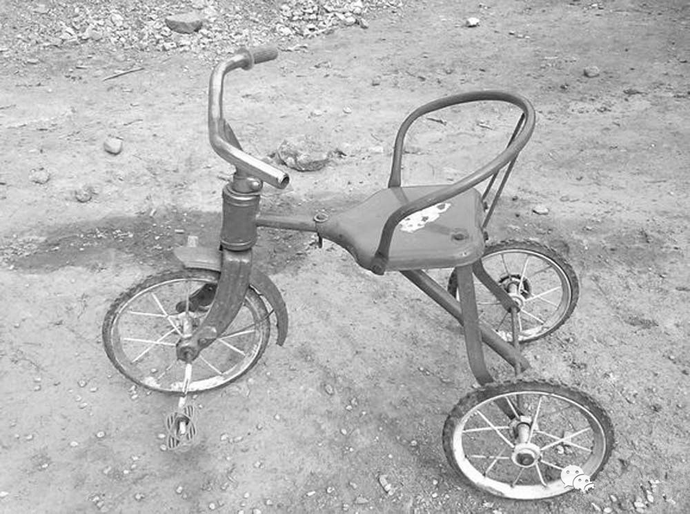 小時候騎的三輪車子跟現在小孩子騎的那可不是一個檔次啊!那可是真正的鐵皮做的,前邊一個轱轆,后邊兩個轱轆!