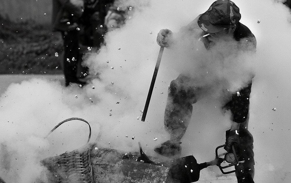 一個黑溜的鐵球,把米或玉米拌著糖精裝在球里面,一會兒工夫隨著蹦的一聲,想噴噴的爆米花就出來了,那時候這真是美味!!!(現在馬路邊還是能經常見到的)