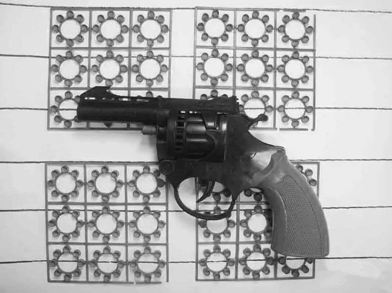 有一種槍,不會打出子彈,但是裝一種火藥味道的圓盤,打一下會有很大的聲音和火花!!!!