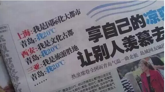 “青島:我20℃“,這是青島網(wǎng)友編的段子。2013年6月27日,這個段子經(jīng)《青島早報》報道后徹底火了,青島的清涼讓全國網(wǎng)友羨慕不已。每年一進(jìn)入6月份之后,青島網(wǎng)友就要拿出這個段子嘚瑟一番。