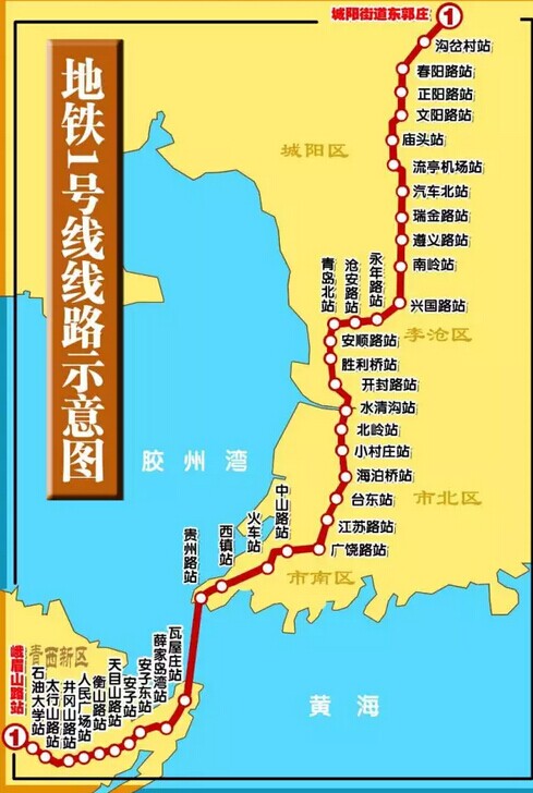 地鐵1號線設(shè)40座車站,其中換乘車站達(dá)12座,起點東郭莊站到終點峨眉山路站,連接了青島火車站、青島北站、青島機(jī)場、黃島汽車站、汽車北站等重要交通樞紐,是一條南北大動脈!