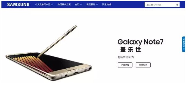 目前,在中國的三星官網上,Note7還仍作為主推商品,在首頁最醒目的地方。