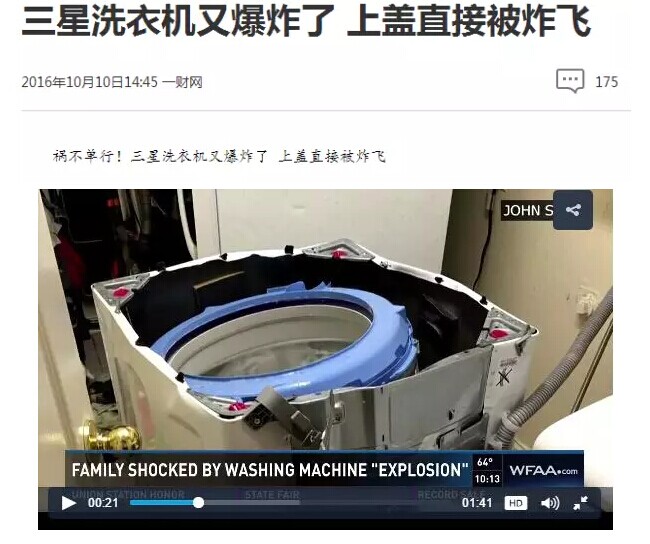美國消費者近日反映,從2011年3月到2016年4月,這5年三星所生產的洗衣機在使用時會爆炸,全美從去年初到今年至少已有21起爆炸!