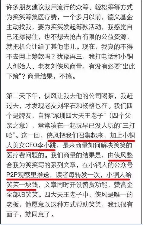 除了用這篇文章的打賞功能籌集醫療費,一家名為“小銅人”的機構介入也助推此事變成朋友圈刷屏的熱點。