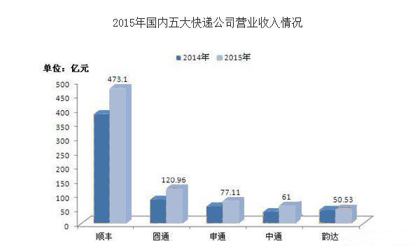 從包裹的來看的話,2016年中通、申通、圓通、韻達、EMS和順豐的市場份額分別為14.3%、12.4%、14.7%、10.5%、6.2%和8.2%。在營收方面,韻達2015年營收為50.53億元,圓通同期營收分別為120.96億元,順豐同期營收分別為473.1億元,申通同期營收分別為77.11億元。中通營收約61億元。