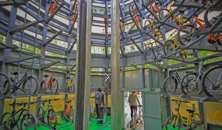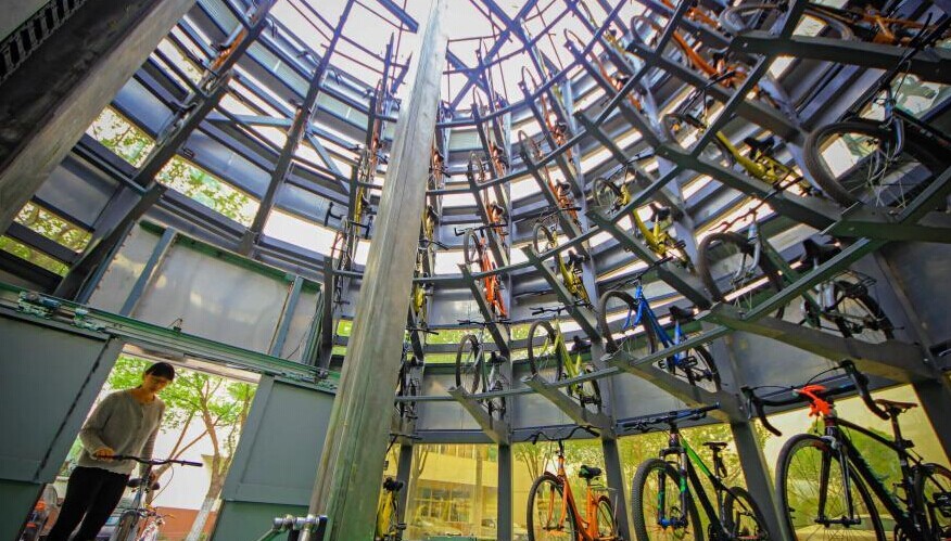 據了解,該存車樓主體為高8米,直徑8米的圓筒狀鋼結構,可存放120輛20-26英寸的自行車,通過刷身份證、學生卡可將自行車快速便捷的存放在車庫內。