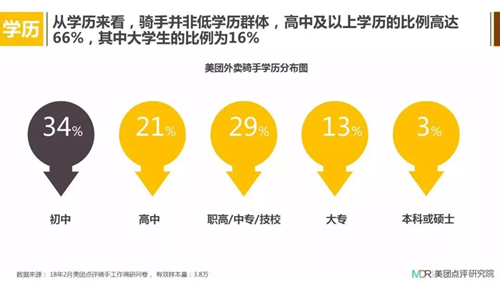 從美團點評研究院發布的《2018年外賣騎手群體研究報告》中我們可以看到,從事騎手職業的人通常來自小城市且文化水平偏低,這就導致騎手在與消費者交流中常因為缺乏溝通技巧產生爭執。也親眼見過騎手去咖啡店取餐,因為對咖啡不了解,普通話又不好,溝通浪費了很長時間,過程中遭店員頻繁白眼。