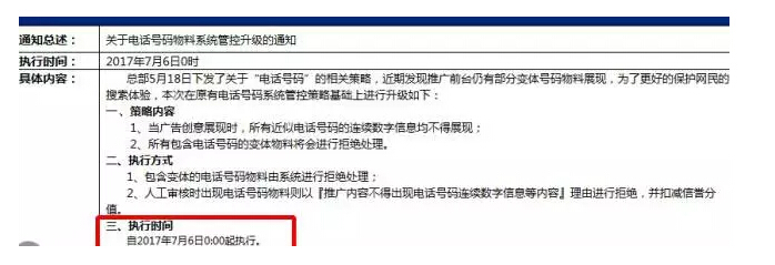 而創意中不得出現近似電話號碼的連續數字,則是從今日(5月19日)23:00起執行,大家提前修改好創意,避免創意不能生效,從而導致流量異常的尷尬。