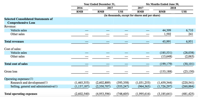 從財務(wù)成績來看,截至2018年6月30日,蔚來汽車2018年前6個月的營收約為695萬美元(約合4600萬人民幣);其中汽車銷售收入為671萬美元(約合4440萬人民幣)。不過,和公司的虧損相比,這些營收簡直是杯水車薪。招股書顯示,蔚來汽車2016年、2017年和2018年上半年的虧損分別為26億元、49.5億元和31.9億元。截至2018年6月30日,蔚來汽車的賬上還有44.8億人民幣現(xiàn)金。