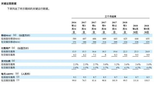 騰訊音樂招股書顯示,截至截至2018年9月30日,騰訊音樂在線音樂付費用戶為2490萬人,付費率達到3.8%,社交娛樂付費用戶990萬,付費率為4.4%。付費轉化率不及Spotify的1/10。