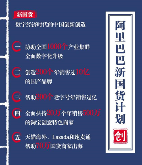 8日,阿里巴巴發(fā)布“新國貨計劃”,其將協(xié)助全國1000個產(chǎn)業(yè)集群全面數(shù)字化升級;創(chuàng)造200個年銷售過10億的國產(chǎn)品牌;幫助200個老字號年銷售過億;全面扶持20萬個年銷售500萬的淘寶創(chuàng)意特色商家;天貓海外、Lazada和速賣通幫助70萬國貨商家出海。